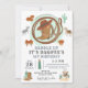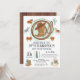 A "saddle up" cute and whimsical wild west cowboy first birthday invitation in terracotta browns and blues for a boy, with western gear cowboy gear and ranch animals. Saddle, steer, horses, cactus, saddle and lasso. Everything as cowboy needs. It's his first rodeo! The back of the invite has a dark brown barn wood effect.