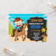 This Brown and blue Country theme invitation features boy riding a horse, sheriff badge and a cowboy boots.