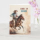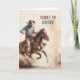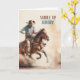 Wish your favorite cowboy, no matter if he's big or small, a Happy Birthday with this great country western themed greeting of a cowboy on horseback with a fun saddle up and ride message.