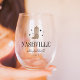 Welcome friends to your bachelorette weekend with these cute personalised stemless wine glasses. Design features a tan cowboy boot illustration with your destination beneath (shown with Nashville) in classic serif lettering. Add your name(s) or occasion name beneath in handwritten cursive script, as well as the year.