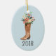 Keepsake ornament features a watercolor illustration of a cowboy boot with floral bouquet on light blue background. Customise with year or other special text