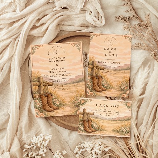 A rustic western wedding design inspired by desert landscapes, warm earth tones, and vintage botanical details. Featuring a sun-washed desert scene, wooden fencing accents, and soft florals, this invitation is perfect for ranch weddings, western celebrations, or couples planning a desert-inspired ceremony. Elegant, timeless, and fully customizable for your special day.