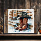 Christmas gift bag depicting a watercolor illustration of cowboy boots and a cowboy hat on the front steps of a log cabin on a snowy winter day.