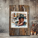 Christmas gift bag depicting a watercolor illustration of cowboy boots and a cowboy hat on the front steps of a log cabin on a snowy winter day.