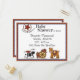 This is our second baby shower invitation in this design with a postcard. The design has stuffed animals to look western with cow, horse, wheel,cowboy hat, cowboy boots and plaid star in deep red.