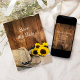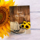 Set a relaxed and rustic tone for your upcoming ranch style nuptials with the charming Cowboy Hat, Sunflowers and Barn Wood Country Wedding Save the Date Announcements. This rustic chic custom western marriage keep the date card features a quaint floral photograph of a cowboy hat, yellow sunflower blossoms, white bridal veil and vintage lace trimmed linen handkerchief with a burlap and weathered brown barn wood background. Perfect inspo or idea for a cowgirl bride and cowboy groom planning a casual farm theme or barn party marriage ceremony and reception celebration event. Available as a printed invitation for mailing or as a digital download for easy sharing digitally online.
