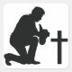 Cowboy silhouette with hat in hands, kneeling beside cross