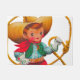 A cute retro style from the 1950s, this little western cowboy is playing with his rope lasso. A western theme for children. He's wearing a cowboy hat, cute western outfit, and getting ready to rustle a cow.