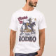 Experience the thrill of the wild west with this dynamic rodeo scene featuring a cowboy, powerful horse, desert landscape, and bold lettering. Perfect for western themes and country events.