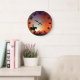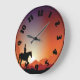This design is a cowboy riding a horse. The cowboy on the horse is heading across the land at sunset. This cowboy riding a horse design looks great on this Clock