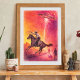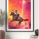 Inspired by retro science fiction posters and classic western imagery, this design merges two iconic genres—space exploration and frontier adventure. The combination of a cowboy, desert mountains, and a hovering flying saucer creates a bold visual story that feels both vintage and futuristic.