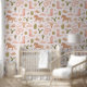 Cute and rustic cowboy theme wallpaper for a girl's room or nursery room featuring illustration of cowboy hats, cowboy boots, snake, horse, cactus, etc.