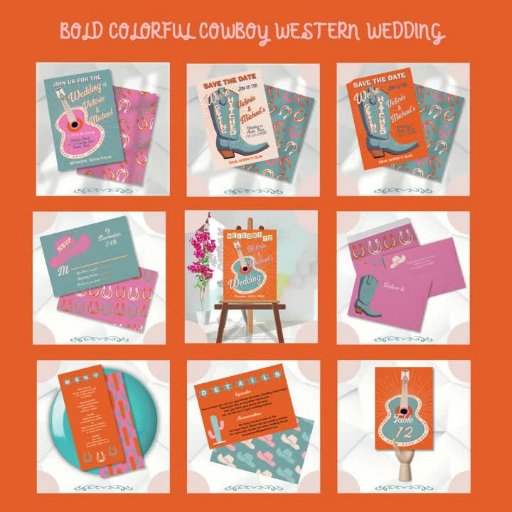 Bold and bright Country Wedding table numbers with fun fonts and a mod retro vibe. Features a western guitar with funky colours of pink, orange, blue and very light creamy white. Perfect for a cowboy country western themed wedding! You'll have to do each number one by one. Hand drawn by McBooboos. To make more changes go to Personalise this template. On the bottom you’ll see “Want to customise this design even further? Click on the EDIT using Design tool. It will take some learning but you can change some of the fonts & some colours, move things around or delete what you need.