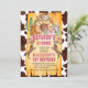 Little cowgirl 1st rodeo horses western farm birthday party invitation with a wheel, cowboy boots, cowboy hat, pink roses, brown cow skin pattern , western wild west style.