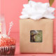 Customise these casual yet classy square Cowgirl and Sunflowers Country Western Wedding Thank You Favour Tag Stickers with the personal names of the bride and groom and their rural ranch marriage ceremony date. These charming custom rustic barn party favour tags feature a quaint farm style photograph of a bride wearing a white lace wedding dress and brown leather cowboy boots carrying a bouquet of yellow sunflower blossoms leaning against a weathered wooden barbed wire fence with green grass.