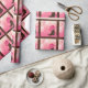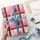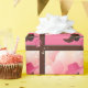 A graphic illustration of a cowgirl boot and hat with party balloons on Birthday wrapping paper.