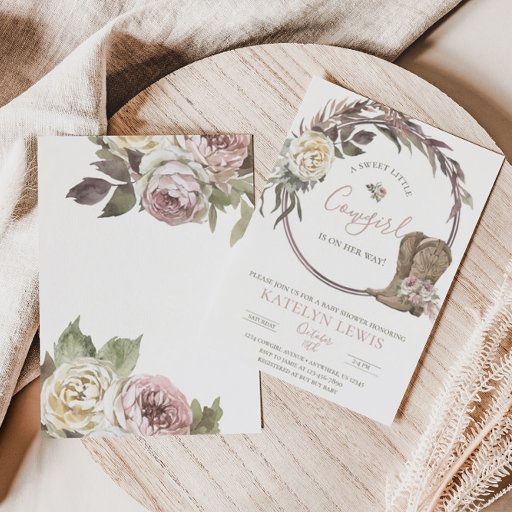 Beautiful cowgirl themed baby shower invitation. Floral wreath accented with boots and flowers. Perfect for a rustic western baby girl shower.
