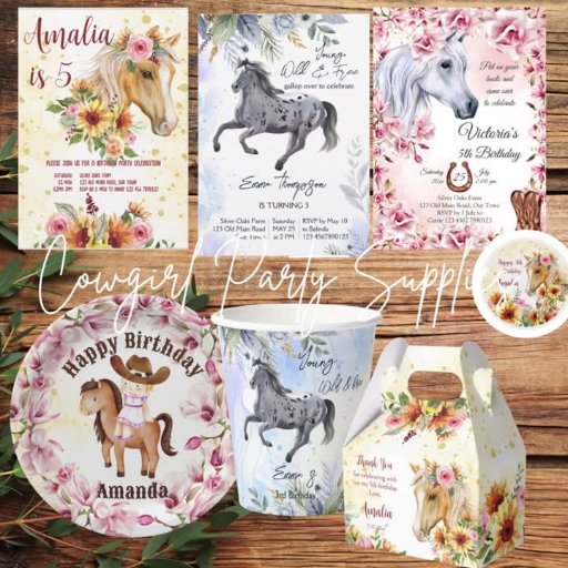 Cowgirl first rodeo horses and farm themed birthday party banner, with a running horse, wheel, cowboy shoes and hat on a burlap photo background.