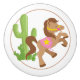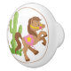This cute knob features a little brown rearing pony wearing a pink saddle with a gold sheriff's star on it. Behind the horse is a tall green cactus. The image is placed on a white background and framed with a thin brown line circle. This knob coordinates with the Pink Horseshoe Cowgirl ceramic drawer knobs in our store.