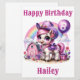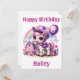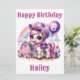 An adorable cowgirl pony is celebrating her 8th birthday with a purple balloon with the number 8 and a purple cowgirl hat on a farm. Personalise the card with your child's name.