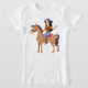 This design is of a cowgirl riding a horse. She has her cowgirl hat on and her cowgirl boots and is sitting on the horse holding on with one hand while waving with the other. This cowgirl riding a horse design looks great on this girls t-shirt. Perfect for yourself or as a gift