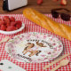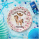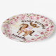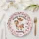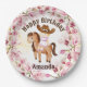 Cute little cowgirl saddle up birthday personalised party plates. Cowgirl riding cute baby horse and pink flowers. Brown and pink yellow farm colours.