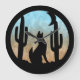 A lovely Southwestern style image featuring a coyote in the desert, surrounded by cacti, howling at the moon in the evening sky.