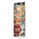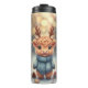 This design features a whimsical and adorable Christmas-themed sublimation print for a straight-sided tumbler. The central motif is a trio of cute, fluffy Highland calf characters dressed in festive winter attire against a soft, snowy backdrop with bokeh lights (out-of-focus lights).