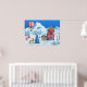 Gorgeous illustration of a deer in the snow near a cozy little cottage in a magical winter landscape, with a hot air balloon in the icy blue sky.