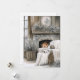 This Christmas holiday card features a rustic stone fireplace glowing in a softly lit room styled with a wicker chair, white throw blanket, and snowy pine garlands on the mantlepiece. A wintry tree print and soft neutral palette add to the calm, cozy feel. The verse Wishing you peace, joy, and happiness this holiday season appears on the back, with space to personalize your name or signature. (You may also write your own greeting or verse instead).