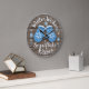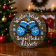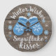 This image features a round wall clock with a cozy, rustic design resembling weathered wooden planks. The face is dominated by an endearing graphic of two blue mittens with white snowflake patterns and furry cuffs. The surrounding text reads, "Winter Wishes & Snowflake kisses," making it a charming and decorative timepiece perfect for adding a touch of warm, seasonal cheer to a home during the colder months.