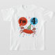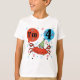 A big red king crab wearing a party hat, blue and red birthday balloons, and confetti is featured on this 4th Birthday design.