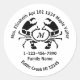 An illustrated crab drawn from the top view in a stenciled style. The claws are opened, legs are spread out, and the top of the shell is a white space for a monogram. Contact info; family name, phone number, and address done in an easy fill in the blank format. Thank mum or dad by helping them with an amazing time saver for labelling the kids lunch bags.