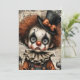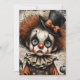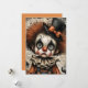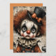 A sorrowful clown child stares through hollow eyes, its pale face painted with dramatic black makeup and a fractured expression. Frizzy auburn hair spills from beneath a black top hat adorned with an orange bow, while a ruffled collar frames a vintage costume in faded shades of orange and blue. Surrounding the figure are ghostly pumpkins and fragments of aged text, evoking a haunted nostalgia. The composition hums with emotional depth and eerie elegance—where whimsy meets weariness, and every crack tells a story.