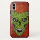 A drawing of a leering skull with a cracked head in a rotting green on a grunge red background.