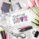 This card features elegant script for the 'Crafted with' portion of text, while 'LOVE' has been crafted with my love :) in photoshop using colourful patterns, buttons, bows and stitching effects. Choose any darker background colour to suit. These cards give you lots of great options; use as gift tags or labels to personalise your hand-crafted gifts, or use as regular business cards to promote your craft sales.