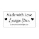 The words 'Made with Love', to personalise your special products with love... your own name or brand in a elegant script font style, and a line to add e-mail or any other additional information about your business... two little love hearts on the sides