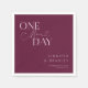 Minimalist wedding rehearsal dinner welcome napkin featuring typography text that says "one more day." The background is cranberry.