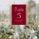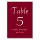 Guide your wedding reception guests to their table with this simple style table number card that features white, stylised lettering on a trendy, cranberry red colour background. Design is on each side of card. Edit your card to change table number, wedding couple's names and date. Order cards separately for each table number.
