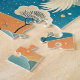 This jigsaw puzzle features a stunning white red and black stork against blue and teal mountains with fall trees tipped in gold. Heavily influenced by traditional Japanese art (Ukiyo-e style), this red-crowned crane symbolizes longevity and good fortune.