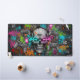 Le Fond Graffiti : L'arrière-plan est un mur sombre et texturé, saturé de tags, de graffitis abstraits et de symboles de la culture urbaine. Les couleurs sont très vives et électriques (rose fluo, vert, bleu cyan), créant un contraste saisissant avec le fond noir et gris.
