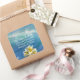 Waves return address square sticker to use as an envelope seal. Blue ocean waves are breaking in the background. White text is added in two places- in script for the name and printed for the address - up to three address lines can be added. White frangipani, or plumeria, flowers at the bottom. Shown on the larger 3 inch stickers for easy to view.