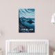 A stunning illustration depicting Crater Lake National Park. A vast, deep blue lake rests within a volcanic caldera, surrounded by snow-capped mountains. Wispy clouds float above the breathtaking vista, adding a touch of serenity.