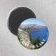 Round, decorative magnet that features a scenic photo image of the sapphire blue lake in Crater Lake National Park, Oregon. Select your magnet size. Makes a great travel souvenir!