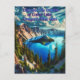 A breathtaking view of Crater Lake in Oregon, showcasing the vibrant blue water reflecting the dramatic cloudscape. The iconic Wizard Island stands majestically in the centre of the lake, adding to the picturesque landscape.