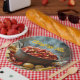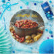 Paper party plates with image of crawfish cooking with potatoes and corn for a summer crawfish boil.