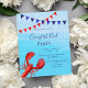 An elegant invitation for a nautical coastal by the sea summer party, beach party or seafood party. Blue sea water as background and a large red lobster and black and red flags as decoration. Templates for your party details, information.