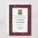 Scottish clan Crawford wedding invitation done in the classic mauve, white and green tartan plaid pattern, with a gold tone edged decorative white text area. Graphics of a two unicorn heads with a thistle between them, decorates the top of the invitation. Personalise the custom text to suit your highland themed wedding.