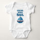 Crawl Walk Sail baby bodysuit for little sailor. Cute nautical one piece jumpsuit for little boy or girl. Cartoon sail boat illustration with bold text. Fun gift idea for baby shower party. Buy one for grandson, son, nephew, cousin etc. Available in white and other colours. Adorable clothing for small kids and newborn children.