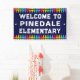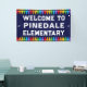 School welcome banner with row of crayons at the bottom and the top! Perfect for entry doors, door to office, or to hang at festivals, fairs and educational programs. See our classroom welcome doormats as well.
